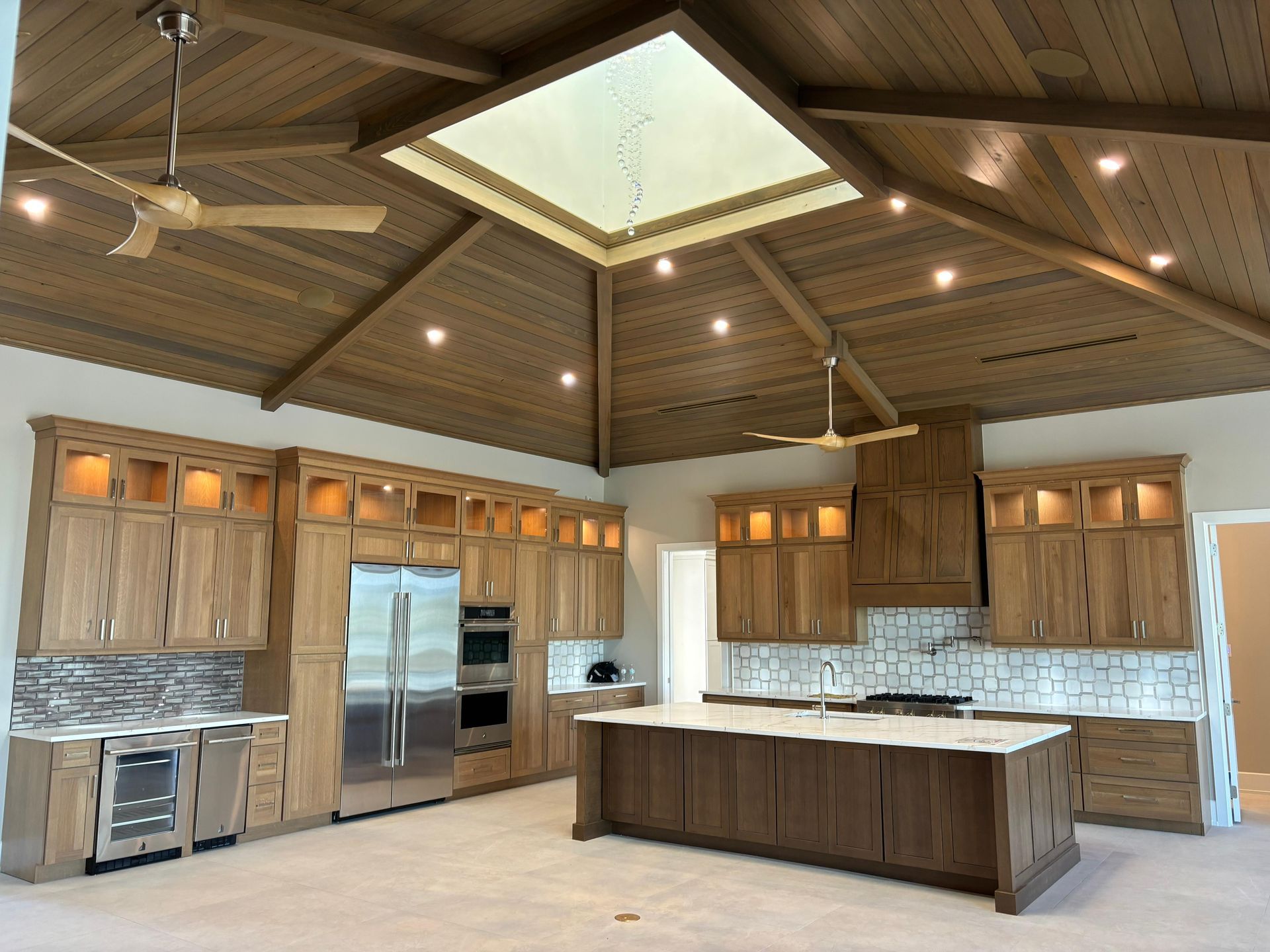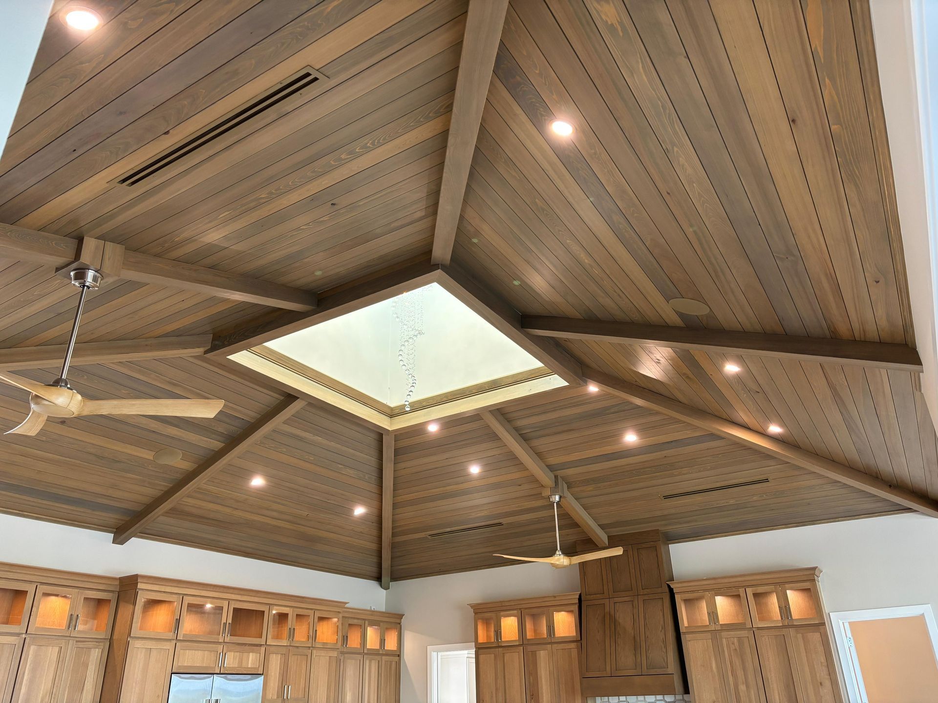 A room with a vaulted ceiling and a chandelier hanging from it